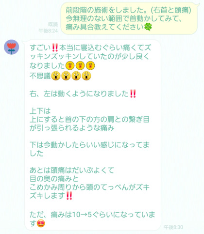 施術をお願いした直後から、ズキンズキンしていた痛みが少しずつやわらぎ、首が右も左も動くように。