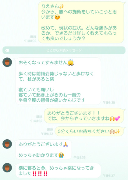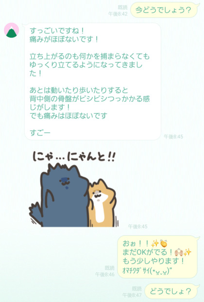 さらに施術を進めていくと、「横に寝ると楽になってきた」「動いたときの痛みがかなり減っている」