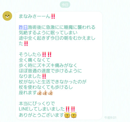 施術のあと、気絶するようにぐっすり眠ってしまい、途中で起きることもなく朝を迎えたそうです。