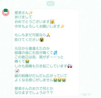 年始から首・肩の強い痛みと頭痛が続き、寝込むほどつらい状態でした。